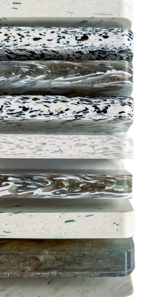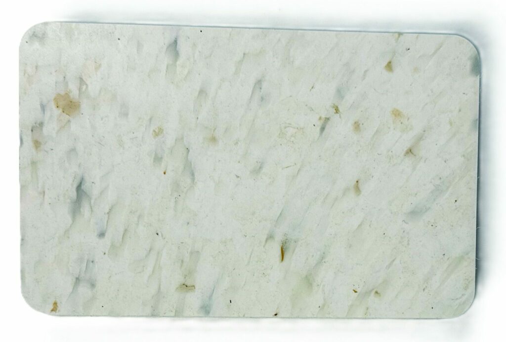 Powstały z recyklingu tacek cateringowych produkt o unikatowym wzorze, fakturze i strukturze, przypominające wyglądem kamień, marmur lub granit, o eleganckim wyglądzie, a przede wszystkim z historią odzysku i odpowiedzialności w tle.