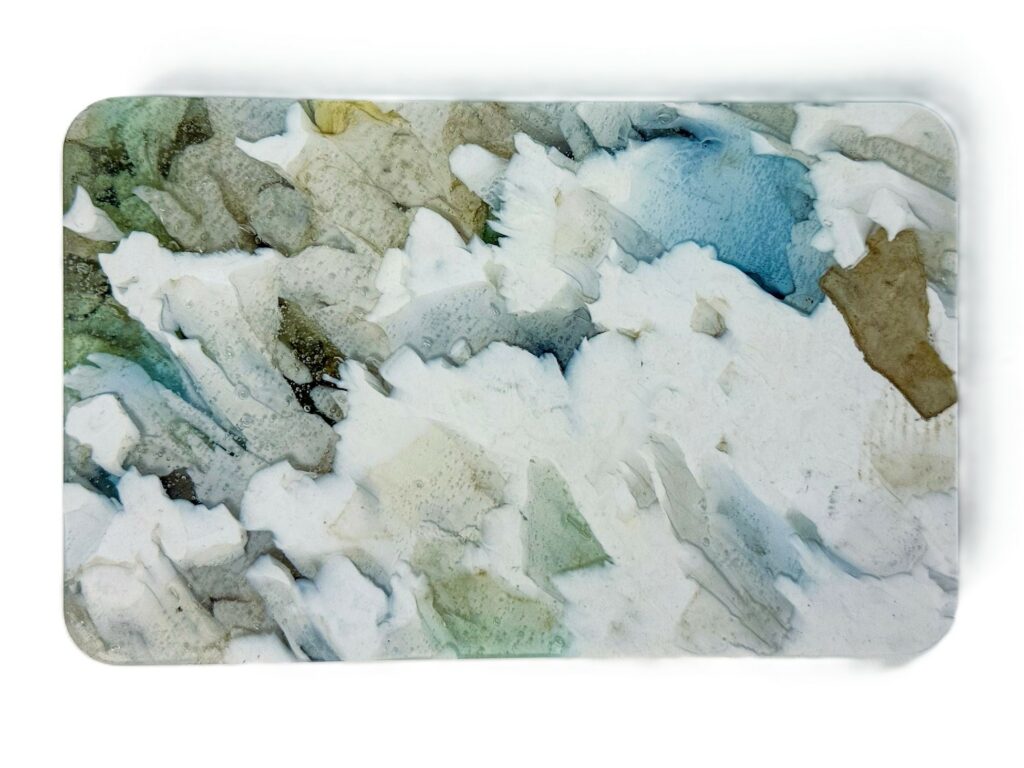 „Ocean Tide” to płyta z HIPS/GPPS, która wygląda tak, jakby uchwycono w niej moment ruchu oceanu.Jej powierzchnia przypomina falowanie wody widziane z bliska: warstwy bieli, szarości i głębokich morskich tonów układają się w organiczne prądy, wiry i rozbryzgi, które wyglądają jak naturalny ślad po spotkaniu fal z kamienistym brzegiem.