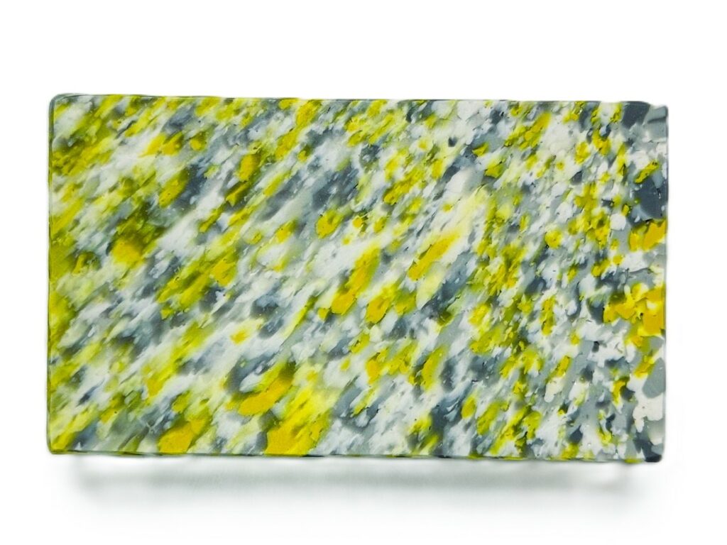 Nie mieszamy tworzyw, dzięki czemu produkt pozostaje w obiegu i w przyszłości może zyskać nowe przeznaczenie. Każda płyta jest wyjątkowa pod względem kolorystyki i wzoru, tworząc niepowtarzalny element przestrzeni. Każdy egzemplarz jest unikalny – proces recyklingu i formowania materiału sprawia, że nie powstają dwa identyczne wzory.
